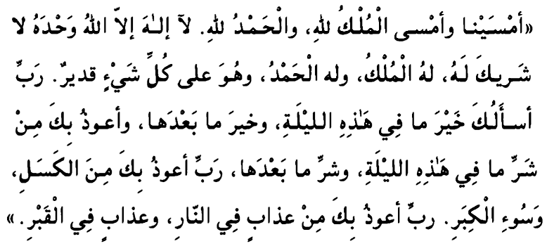 Amsayna wa-amsal mulku lillah, wal-hamdu lillah. La ilaaha illAllahu wahdahu Ia sharika lahu, lahul- mulku wa-lahul hamd, wa-huwa 'ala kulli shayin qadir. Rabbi asaluka khayra maa fie hathihil laylati wa- khayra maa badaha, wa-authu bika min sharri maa fie hathihil laylati wa-sharri maa badaha. Rabbi authu bika minal kasali wa-suuil kibar. Rabbi authu bika min 'athabin fin-nari wa-athabin fil-qabr.