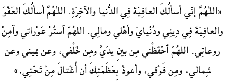 Allahumma inni asalukal 'aafiyata fid-dunya wal- akhirah. Allahumma asalukal 'afwa wal-afiyata fie dieni wa-dunyaya wa-ahli wa-maali. Allahummastur 'awrati wa-amin rawa'ati. Allahummahfasni min bayni yadayya wa-min khalfi, wa- an yamini wa-'an shimali, wa-min fauqi, wa-authu bi-'asamatika an ughtaala min tahti.