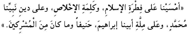 Amsayna 'ala fitratil-Islam, wa-kalimat il-ikhlas, wa- 'ala dini nabiyyina Muhammad, wa-ala millati abina Ibrahima hanifan wamaa kana minal-mushrikien.