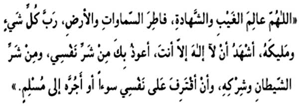 Allahumma 'alimal ghaybi wash-shahadat, fatir as-samawati wal-ardh, rabba kulli shay in wa-malikah, ash-hadu ala ilaha illa ant, authu bika min sharri nafsi, wa-min sharr ish-shaytani wa-shirkih, wa-an aqtarifa 'ala nafsi suan au ajurrahu ila Muslim.