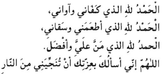 Al-hamdulilla-hilasi kafani wa-awani; al-hamdu lillahil-lathi at amani wa-saqani; al-hamdu lillahil- lathi manna 'alayya wa-afdal. Allahumma inni as-aluka bi-is-satika an tunajjiyani minan-nar.